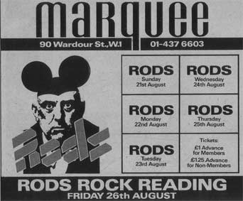 Driving to Keele University, playing on stage with the Hot Rods, then driving back to Southend is one thing not to be attempted with a car whose top speed seemed limited by the prevailing wind. I think I played 96 tears, Kids are all right On the run and Get out of Denver, together with a riotous Gloria as encore. Driving back, coming into Southend as the sun was rising, all was right on the planet. I was doing exactly what I wanted to do and I was having a shit-load of fun. Life doesn't get much better. Little did I know (pun intentional). The next night at the Rainbow, what was a theatre with stalls became a dance-hall - the seats were trashed by the excited audience, and trampled to matchsticks. It was not to be the only night in the next few years that I would come off stage with ringing in my ears.