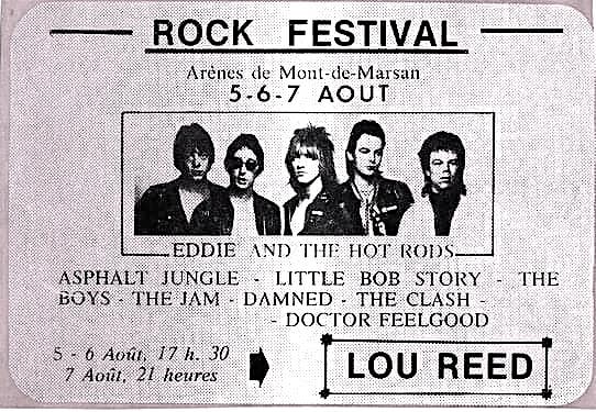 A bit of rehearsing next, and organising some new songs for the next album. We used the Island HQ at St. Peters Square and the famous Basing Street Studio, and quickly learned a couple of mine and couple of Dave's. We were also editing the live tapes from the Rainbow concerts, and discovered, to everyone's surprise, that my guitar had not made it onto the multi-track. Quelle horreur! Ed really wanted to put out a live E.P. from the gig. With little regard to the truth, it was decided that, if I went into the studio and played along in Real Time with the tracks, that would constitute a Live Performance. Live Albums, in those days, were routinely “polished up” in the studio, so, if I only played one take of each song, then it was OK. This was At the Sound of Speed, a title coined by Howard Thompson, the band's greatest fan at Island Records. We also found time to record Dave's song I might be lying, Do anything, and something or other (for the B side to Lying). By this time, the Press had cottoned on to the fact that the Hot Rods had a new member, and so had CBS. Now I'd signed to CBS as part of the Kursaals, and I expected them to release me without any problems. The corporate minds there realised that there was a New Wave of music happening, and they didn't have any part of it signed! Suddenly they wanted to hold me to my contract and insisted that I supplied them with an album's-worth of new material in demo form. They weren't going to pay me any money to do any recording, they were just going to extract their pound of flesh by refusing to let me sign to Island Records. Contractually, I had to comply. While Steve Lilywhite, Ed Hollis and myself were mixing Do anything at Island, which involved quite a few guitar overdubs to get that famous droning slightly off-tune sound, I banged out a dozen ideas with guitar and piano. They were ROUGH Demos, recorded straight to two-track, with no FX and no overdubs. I think it took about two hours. CBS knew I was taking the piss so they refused to release me. They couldn't stop me playing with the Hot Rods (although they tried their damnedest), which is why Mike Read introduced a radio show by the Hot Rods from the Paris theatre, featuring an appearance by new-boy Rikki Rocket on guitar. Such is fame! The next day we were on the ferry for a trip to Belgium and France.